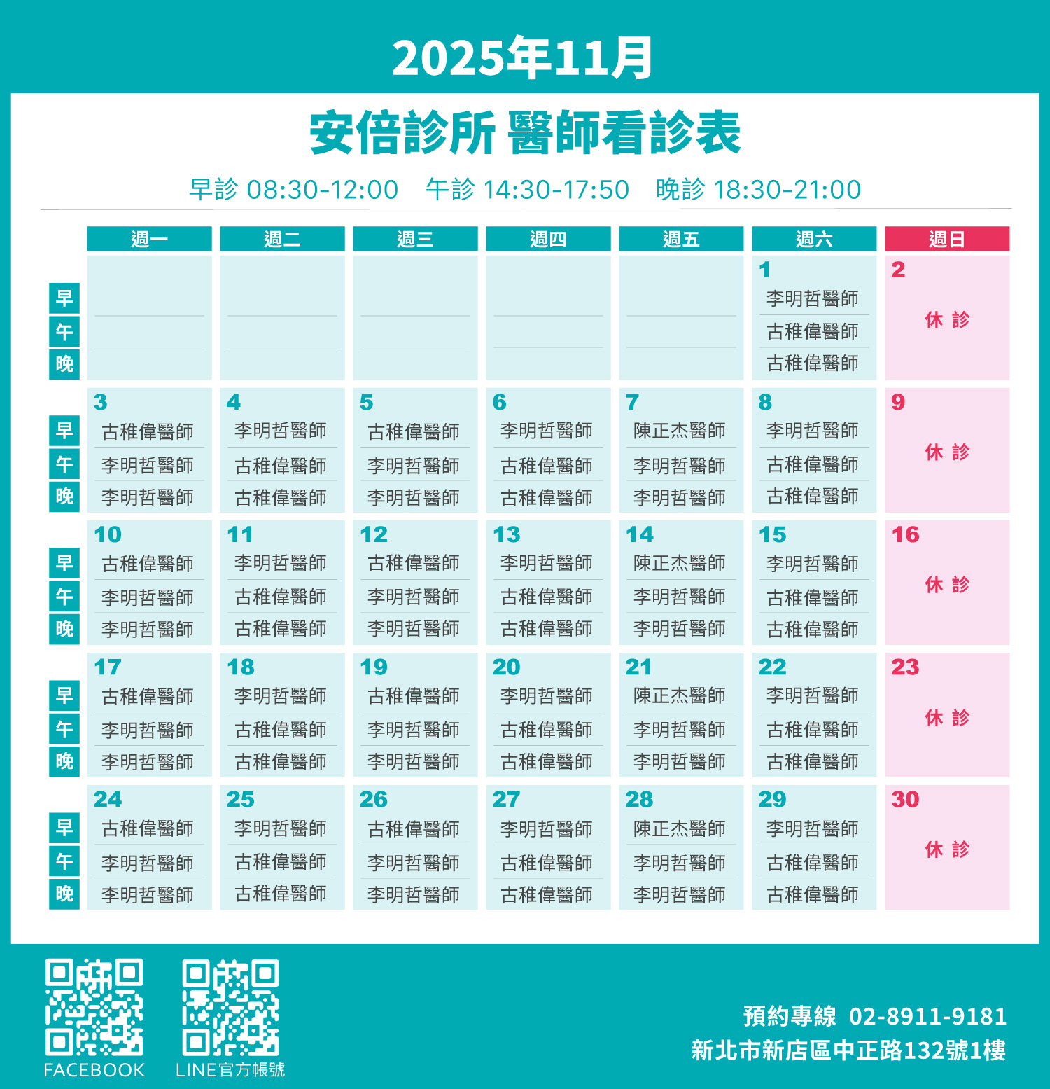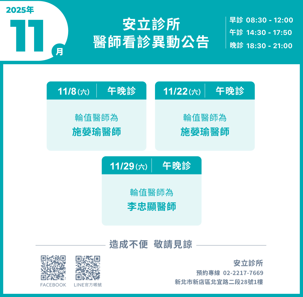 10/6(一)中秋節、10/10(雙十節)、10/25(光復節)僅上午看診,其餘時段正常看診。