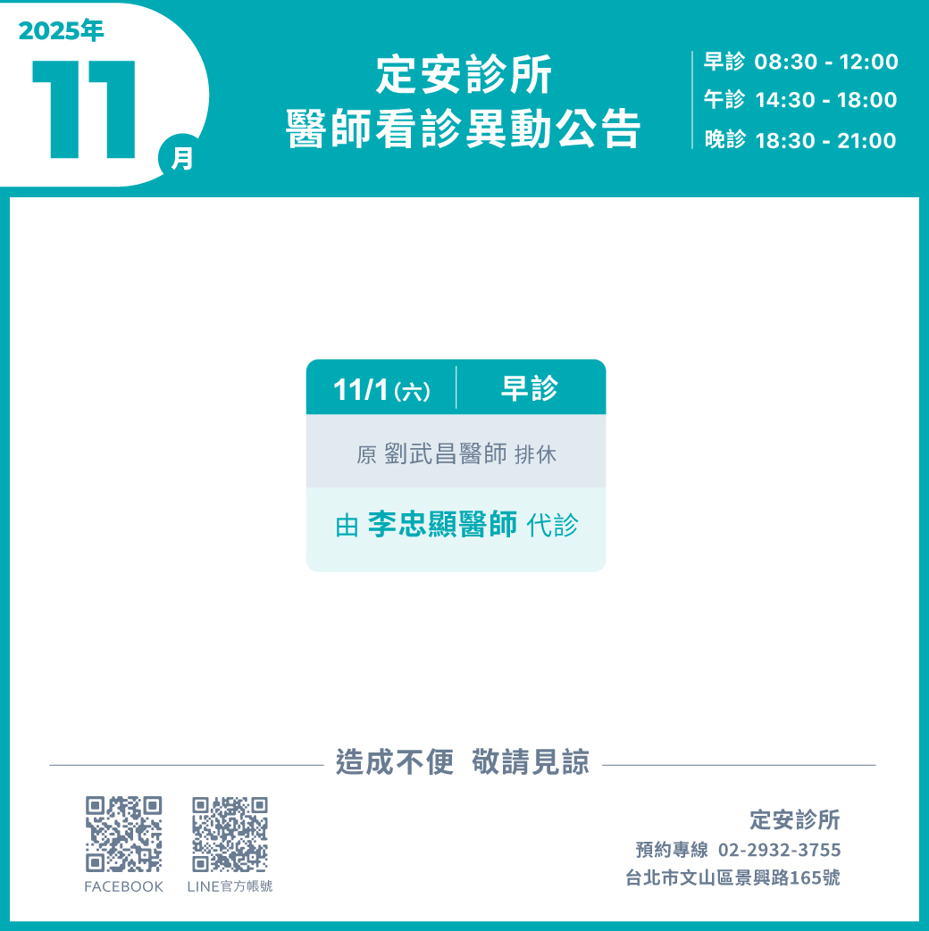 【定安診所】2025年7月起,原張靖怡醫師門診僅保留週五午診,其他時間改由陳建惠醫師看診。